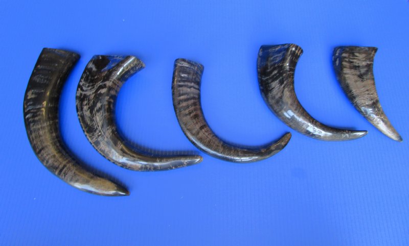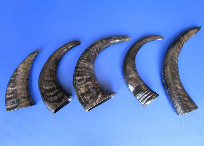 You will receive horns similiar to those shown in the photo. No two horns are identical. They will vary in coloring, shading and size. These horns are measured around the curve of the horn using a cloth tape measure -- NOT straight with a wood ruler. Some of these horns have a tiny patch at the tip of the horn where a tiny hole was drilled to release the pressure and allow removal of the inner bone.
