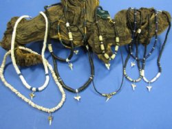 Atlantic Coral Enterprise sells wholesale shark teeth necklaces and bulk shark teeth. We carry shell necklaces with shark tooth pendants in 18 inches and 20 inches in length and shark teeth necklaces on black leather straps decorated with carved beads and wire springs and also with gold capped shark teeth.  For people wanting to make their own necklaces, we have decoratively burnt and wired mako shark tooth pendants.  We also carry real mako shark teeth in bulk for making shark jewelry and shark tooth pendants.