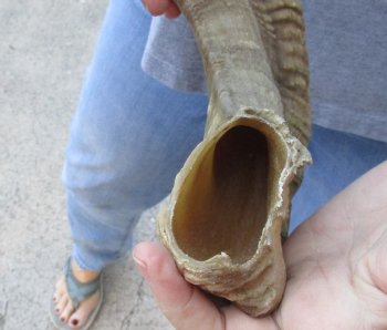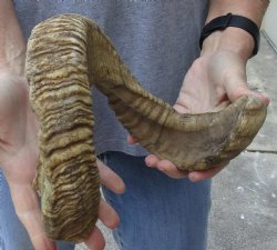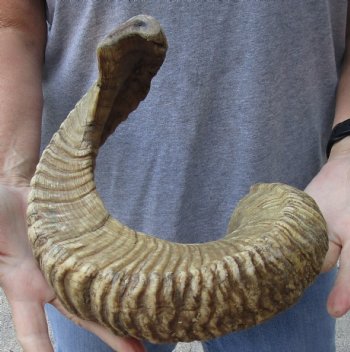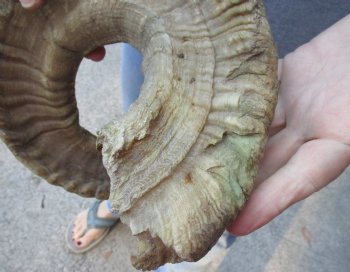 This sheep (Ovis Aries) horn measures approximately 26 inches in size. This sheep horn will have natural imperfections including, gouges, holes, splits, missing sections of top layer, etc. from aging and fighting -  Review photos. Sheep horns are measured around the curl of the horn - not straight. Sheep horns are used in making blowing horns, furniture legs, lamps, sconces, knife handles, cane handles, inlaid crafts and numerous other taxidermy crafts. Our ram horns are a by-product of the farming industry and Government culling programs. Our ram horns are imported from India and South Africa.