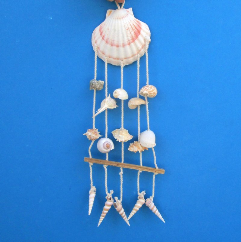 Case of Wholesale Large Irish Baking Scallop Shell Wall Hanger, Shell Wind Chime measuring approximately 17 inches long and 6 to 7 inches wide, (not counting the hanger).  This Seashell hanger features a 4 inch large Irish Baking Shell and five rows of rope with assorted natural hanging small conchs, babylonia, pectens, clams, scallops, turbans, murex, cockles and other seashells.  There is a wood divider at the end of the rows of assorted shells and a single Indian turritella shell is hanging from the end of each row.  This beautiful shell hanger (wind chime) would make an attractive accent on a patio or den or to beach shops who cater to tourists looking for seashell gifts and coastal home decor.