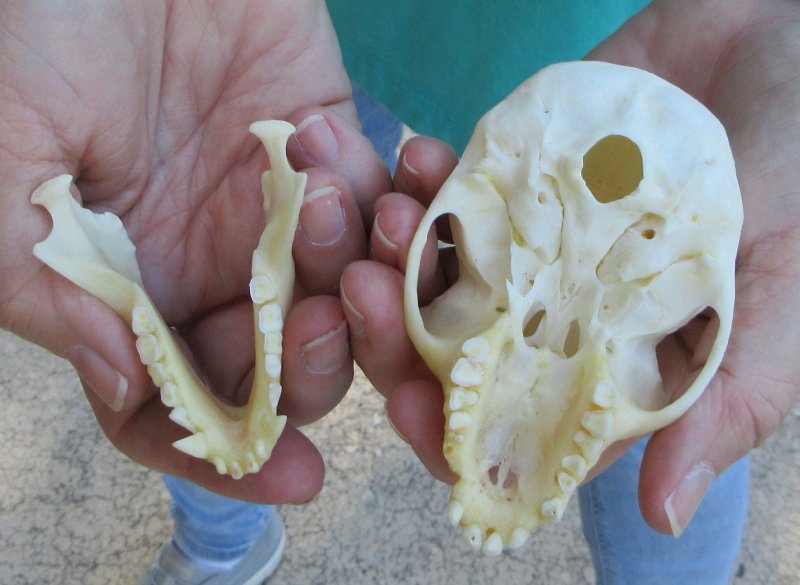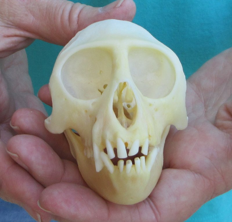 Slight B-Grade Female African Vervet Monkey Skull (Chlorocebus pygerythrus) for salemeasuring approximately 3-3/4 inches long and 2-1/2 inches wide.  Missing Tooth - Review all photos.  All of our monkey skulls are commercial grade and imperfect. They will have imperfections due to the natural aging process and living in the wild--scars, blemishes, rub areas, broken or missing teeth, bug bite marks, etc. This vervet monkey skull was professionally cleaned and cleared by the U.S Fish and Wildlife Services and U.S Customs Services for legal entry into the United States. These were obtained from the African Government's Culling Program.