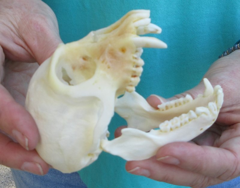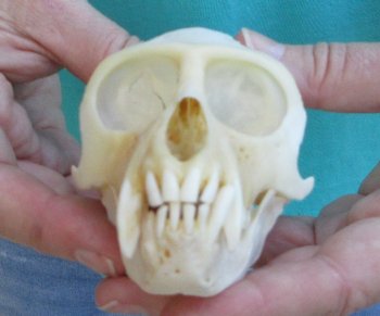 Slight B-Grade Male African Vervet Monkey Skull (Chlorocebus pygerythrus) for salemeasuring approximately 4 inches long and 2-1/2 inches wide.  Slight discoloration - Review all photos.  All of our monkey skulls are commercial grade and imperfect. They will have imperfections due to the natural aging process and living in the wild--scars, blemishes, rub areas, broken or missing teeth, bug bite marks, etc. This vervet monkey skull was professionally cleaned and cleared by the U.S Fish and Wildlife Services and U.S Customs Services for legal entry into the United States. These were obtained from the African Government's Culling Program.