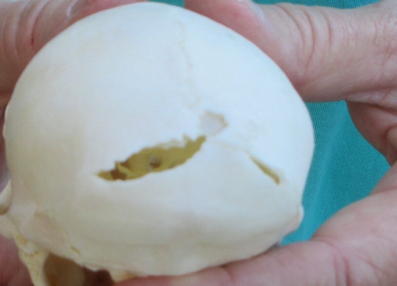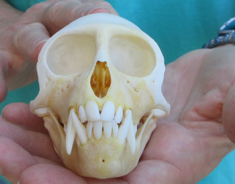 Slight B-Grade Male African Vervet Monkey Skull (Chlorocebus pygerythrus) for salemeasuring approximately 4 inches long and 2-1/2 inches wide.  Hole in back of skull - Review all photos.  All of our monkey skulls are commercial grade and imperfect. They will have imperfections due to the natural aging process and living in the wild--scars, blemishes, rub areas, broken or missing teeth, bug bite marks, etc. This vervet monkey skull was professionally cleaned and cleared by the U.S Fish and Wildlife Services and U.S Customs Services for legal entry into the United States. These were obtained from the African Government's Culling Program.