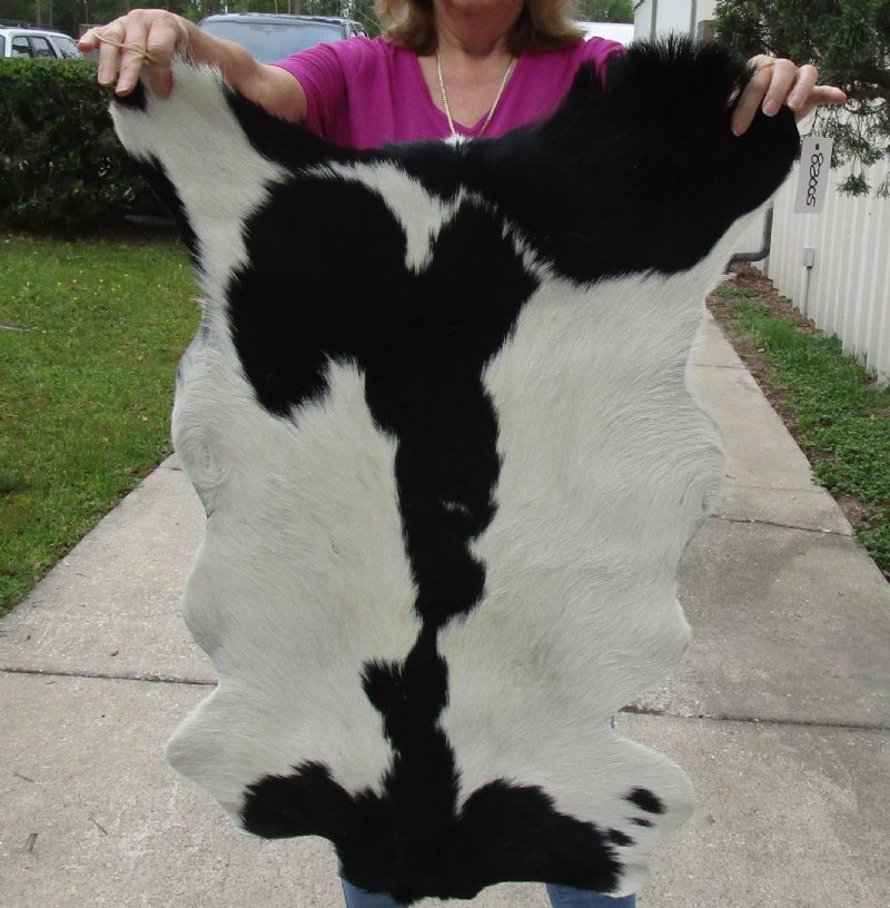 Small Goat Hide/Skin (Capra aegagrus hircus) for sale, measuring approximately 35 inches long and 24 inches wide. Review all photos. Goat hides, goat skins are used for making Native American Drums , goat skin pillows, purses and in other taxidermy crafts. This is a real skin/hide - not imitation. It will have natural imperfections such as sections of sparse fur or small holes in the hides, uneven neckline, uneven body shape or uneven leg cuts. It was imported from India, where goats are used for milk and meat.
