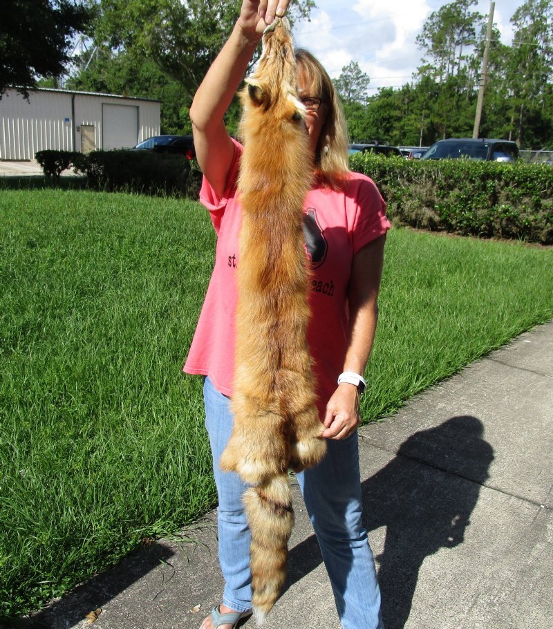 Wholesale Soft tanned red fox pelts for sale, red fox skins, hides. These red fox pelts, skins, hides are from wild red fox and will have imperfections that are normally found on all wild animals. These red fox skins measure between approximately 47 inches to 49 inches long. These red fox pelts/furs will vary in size and color. The red fox features a rich reddish-orange to deep copper coat, often with darker markings along the spine. The underside, throat and chest are typically creamy-white or grayish, white the legs and ear backs are distinctively jet black. Red fox pelts are highly versatile natural materials primarily used in luxury fashion, home decor and traditional crafts.