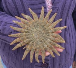 Wholesale bulk Sunflower starfish, also referred to as the sea stars. Sunflower stars are the fastest moving and largest of the sea stars, they can move up to 4' a minute. Coupled with up to 24 arms, you can easily see where they get their name. These unusual sunflower starfish are used in making seashell mirrors, shell wreaths, and placed in seashell baskets as an accent to any beach cottage design decor. Since these starfish are more compact with shorter arms, it makes a nice addition to crafts that require a sturdier, less fragile, starfish.