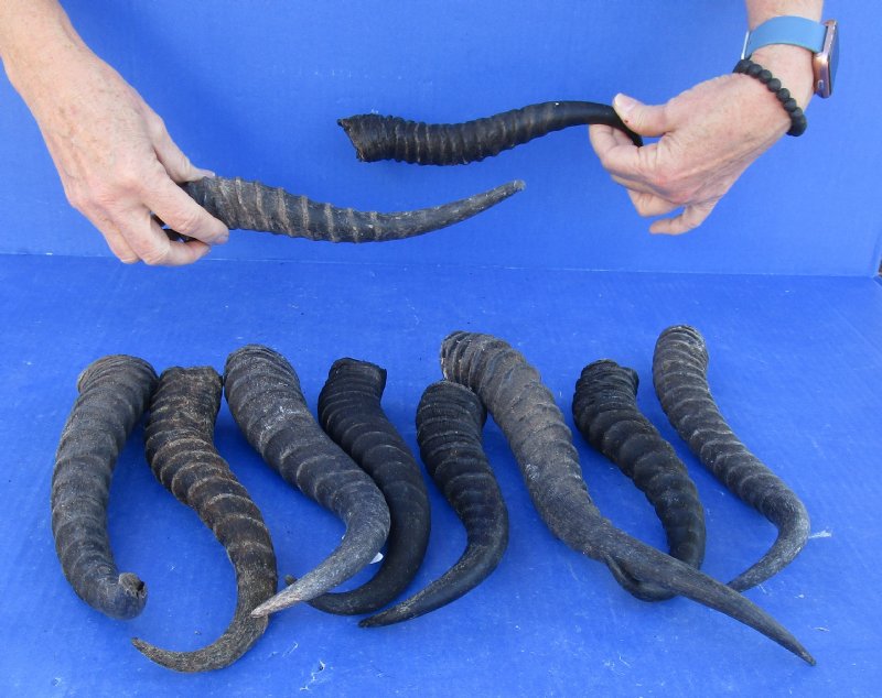 10 pc lot of male springbok horns from Africa for horn crafts measuring approximately 10 to 14 inches long, measured around the curve of the horn with a cloth tape measure, not up and down with a straight ruler. The bases of some of the horns may have splits and chips and small rough spots on horns - review photos.  These 10 pc lot springbok horns, Antidorcas marsupialus, are from wild male springbok animals and will have imperfections normally found on all wild animal horns.