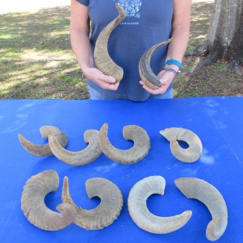 10 piece lot of sheep horns, ram horns imported from India and Africa. These ram horns, sheep horns measure between 12 to 18 inches measured around the curl of the horn. Review all photos. Ram horns and sheep horns are used in horn craft, making shofars, blowing horns, furniture legs, lamps, sconces, knife handles, cane handles, inlaid crafts and numerous other taxidermy crafts.