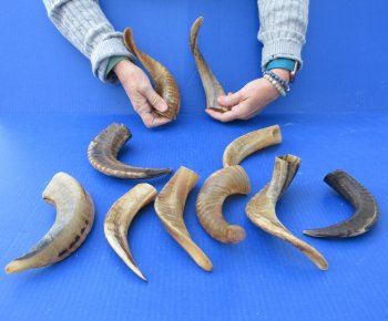 10 piece lot of sheep horns, ram horns imported from India and Africa. These ram horns, sheep horns measure between 8 to 12 inches measured around the curl of the horn. These horns have been buffed making the horns appear shiny. Ram horns and sheep horns are used in horn craft, making blowing horns, furniture legs, lamps, sconces, knife handles, cane handles, inlaid crafts and numerous other taxidermy crafts.