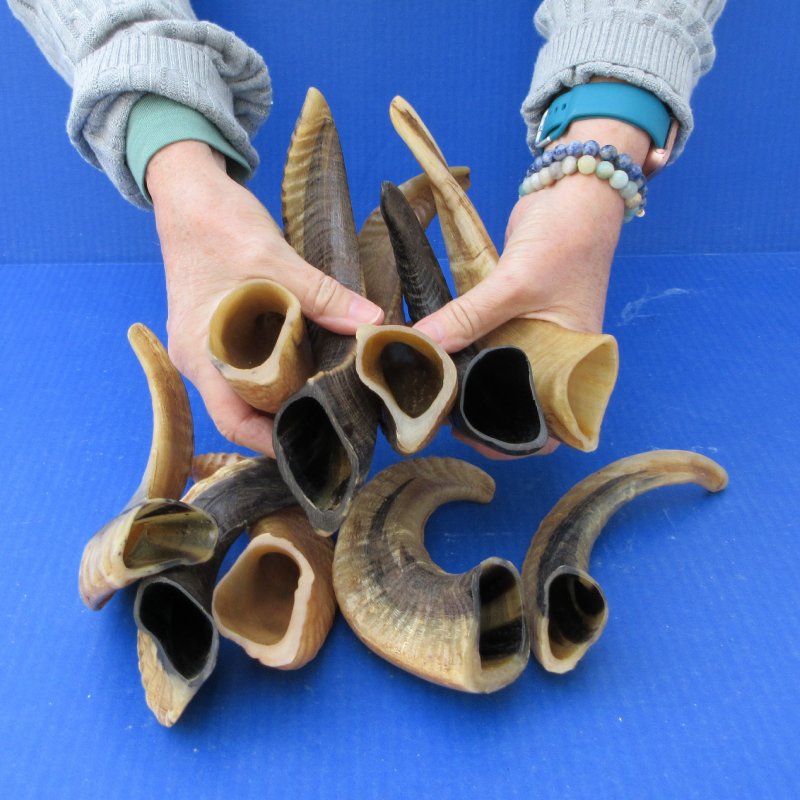10 piece lot of sheep horns, ram horns imported from India and Africa. These ram horns, sheep horns measure between 8 to 12 inches measured around the curl of the horn. These horns have been buffed making the horns appear shiny. Ram horns and sheep horns are used in horn craft, making blowing horns, furniture legs, lamps, sconces, knife handles, cane handles, inlaid crafts and numerous other taxidermy crafts.