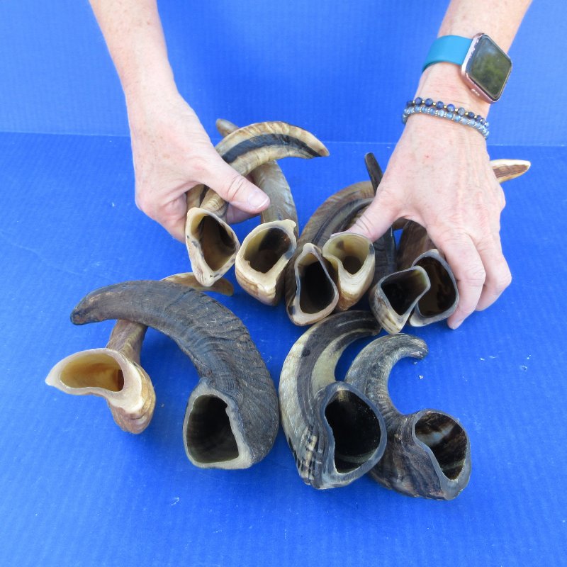 10 piece lot of sheep horns, ram horns imported from India and Africa. These ram horns, sheep horns measure between 8 to 12 inches measured around the curl of the horn. These horns have been buffed making the horns appear shiny. Ram horns and sheep horns are used in horn craft, making blowing horns, furniture legs, lamps, sconces, knife handles, cane handles, inlaid crafts and numerous other taxidermy crafts.