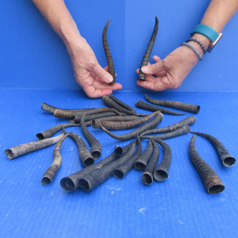 30 pc lot of B-Grade female springbok horns from Africa for horn crafts measuring between 4 to 6 inches long, measured around the curve of the horn.  These horns are b-grade horns and will have splits, cracks, fraying, damaged tips, and gouges. Review all photos. These 10 pc lot springbok horns, Antidorcas marsupialus,  are from wild female springbok animals and will have imperfections normally found on all wild animal horns.