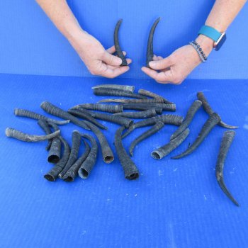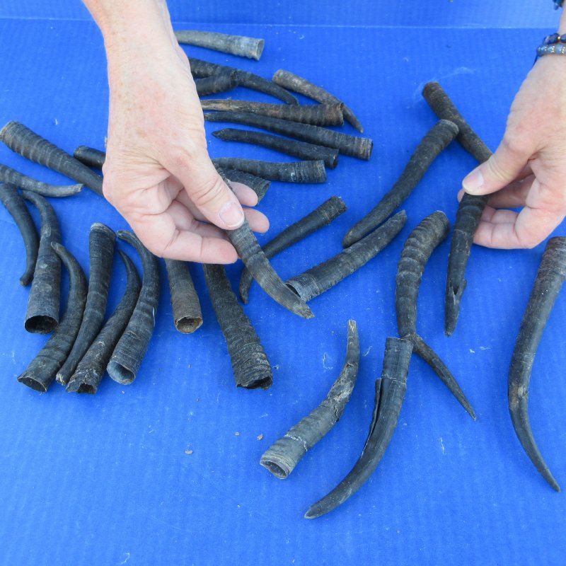 30 pc lot of B-Grade female springbok horns from Africa for horn crafts measuring between 4 to 7 inches long, measured around the curve of the horn.  These horns are b-grade horns and will have splits, cracks, fraying, damaged tips, and gouges. Review all photos. These 10 pc lot springbok horns, Antidorcas marsupialus,  are from wild female springbok animals and will have imperfections normally found on all wild animal horns.