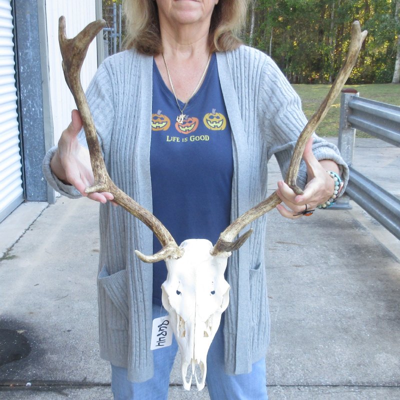 This is a Fallow Deer (Dama dama) Skull measuring 10 inches with horns (antlers) that are approximately 16 and 17 inches long. Review photos. The horn height is measured from the base of the horn using a straight ruler to the longest point of the horn.  The width is measured with a ruler straight across from the left furthest tip of horn to the right furthest tip of horn.