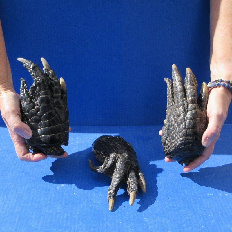 3 Piece Lot of Preserved Alligator Feet, measuring approximately 6 to 7 inches in length. The ends of the foot have been rough cut and painted black.  Review all photos. This alligator foot will have an odor from the preservation process that will subside over time. This is a Real Gator Foot - Not a Replica. It will have natural imperfections. These alligator feet come from gator farms where the gators are harvested for their meat and hide.