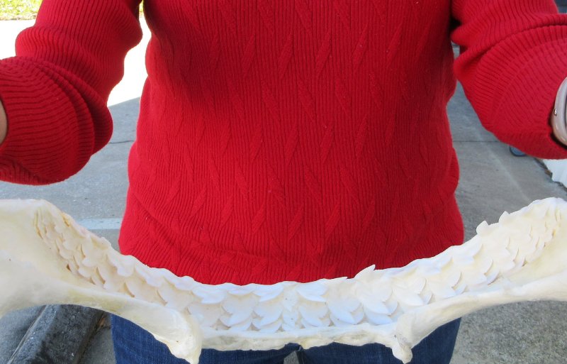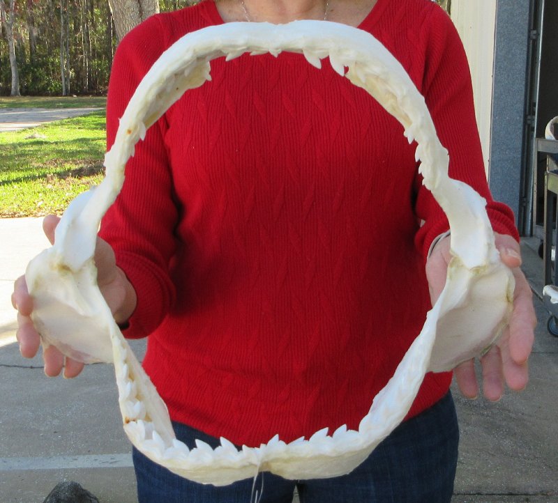 Tiger (Galeocerdo cuvier) shark jaw for sale,  measuring approximately 14 inches wide and 12 inches tall measured straight across jaw from left side to right side.   This tiger shark jaw for sale is used for display and for shark collectors. Our shark jaws for sale imported from Taiwan have been cleaned and whitened.  this jaw was obtained from the Taiwan fishing industry and are not protected or endangered.  This is a real shark jaw and will have imperfections such as cuts or scrapes on the cartilage area, some missing or broken teeth, some small holes in the cartilage and there may be an odor from the cleaning and whitening agents used. The U.S. Fish and Wildlife Department and U.S. Customs have cleared these for legal entry into the U.S.  Sharks have numerous rows of very sharp teeth.  When one tooth falls out, another will move forward and replace it.  Sharks don't chew their food.  They use their powerful sharp teeth to bite and rip their food.