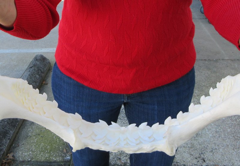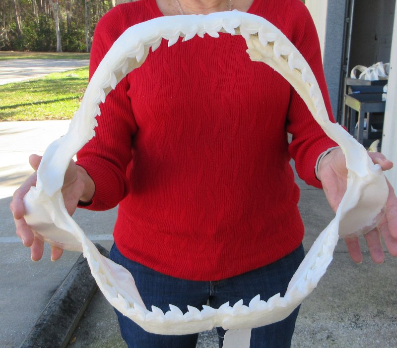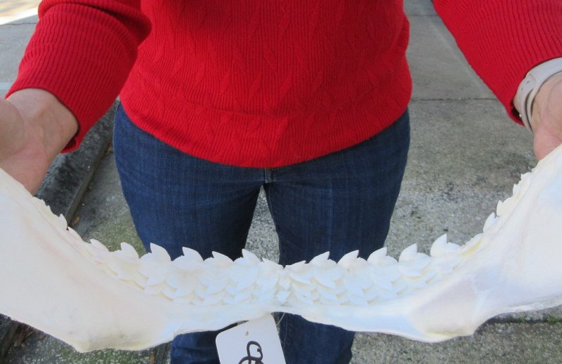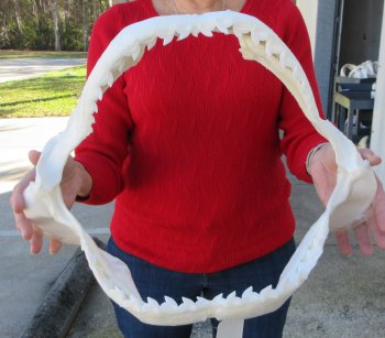 Tiger (Galeocerdo cuvier) shark jaw for sale,  measuring approximately 17 inches wide and 13-1/2 inches tall measured straight across jaw from left side to right side.   This tiger shark jaw for sale is used for display and for shark collectors. Our shark jaws for sale imported from Taiwan have been cleaned and whitened.  this jaw was obtained from the Taiwan fishing industry and are not protected or endangered.  This is a real shark jaw and will have imperfections such as cuts or scrapes on the cartilage area, some missing or broken teeth, some small holes in the cartilage and there may be an odor from the cleaning and whitening agents used. The U.S. Fish and Wildlife Department and U.S. Customs have cleared these for legal entry into the U.S.  Sharks have numerous rows of very sharp teeth.  When one tooth falls out, another will move forward and replace it.  Sharks don't chew their food.  They use their powerful sharp teeth to bite and rip their food.
