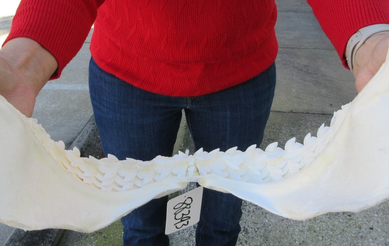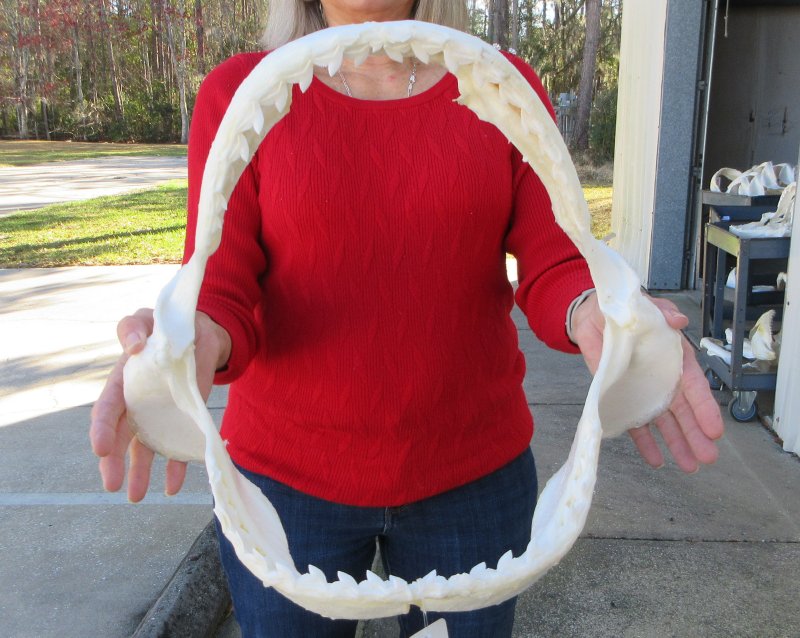 Tiger (Galeocerdo cuvier) shark jaw for sale,  measuring approximately 17 inches wide and 15-1/2 inches tall measured straight across jaw from left side to right side.   This tiger shark jaw for sale is used for display and for shark collectors. Our shark jaws for sale imported from Taiwan have been cleaned and whitened.  this jaw was obtained from the Taiwan fishing industry and are not protected or endangered.  This is a real shark jaw and will have imperfections such as cuts or scrapes on the cartilage area, some missing or broken teeth, some small holes in the cartilage and there may be an odor from the cleaning and whitening agents used. The U.S. Fish and Wildlife Department and U.S. Customs have cleared these for legal entry into the U.S.  Sharks have numerous rows of very sharp teeth.  When one tooth falls out, another will move forward and replace it.  Sharks don't chew their food.  They use their powerful sharp teeth to bite and rip their food.