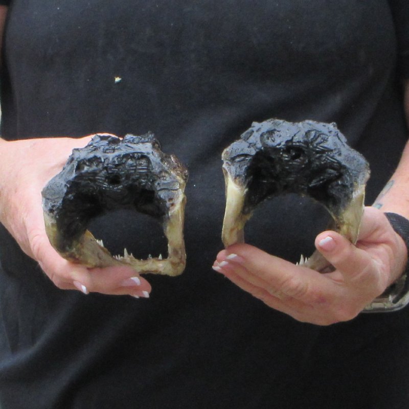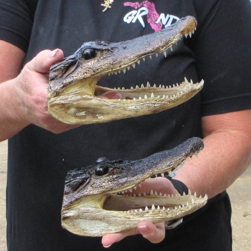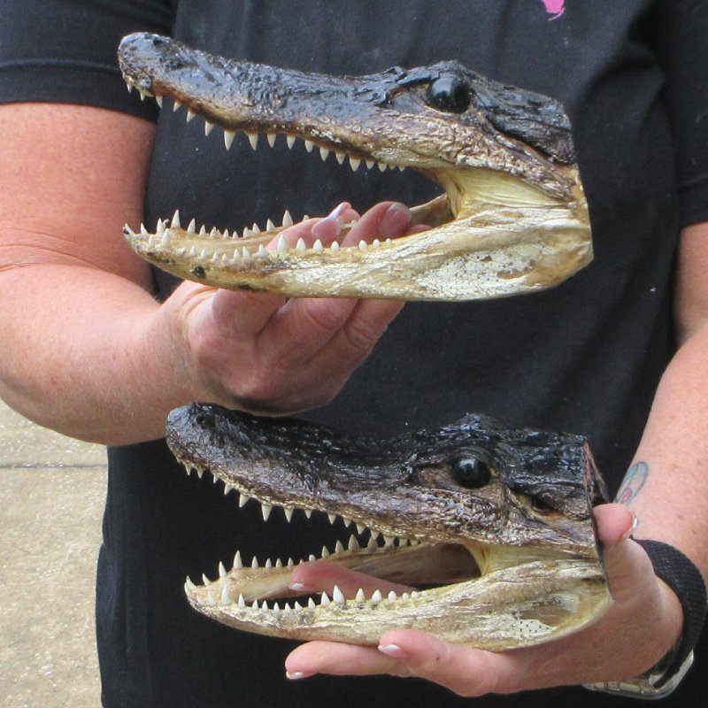 2 piece lot of taxidermy alligator heads. These alligator heads measure approximately 7 to 8 inches long. These gator heads may have missing/broken teeth, scars, scrapes, cuts, etc. These are real alligators, from alligator farms and wild alligators, and will have imperfections due to fighting. Review all photos. These gator heads do not have felt backing - the open backs of the heads have been rough cut and painted BLACK. There might be an odor from the clear sealant used on these heads. The odor will subside over time. Alligators have between 74 and 80 teeth in their mouth at a time. As teeth wear down they are replaced. An alligator can go through 2,000 to 3,000 teeth in a lifetime. A taxidermy process cures the alligator skin and the alligator skull so it will be preserved for years.