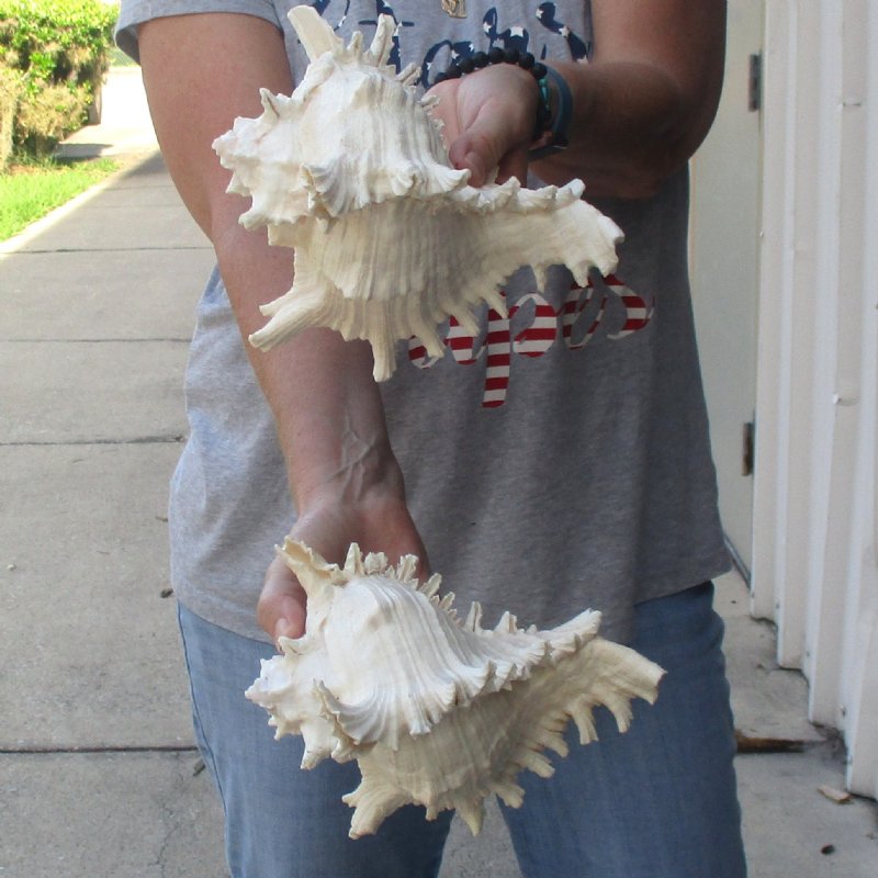 2 piece lot of Murex Ramosus (Chicoreus ramosus) for sale, also called Giant Murex shells, each measuring approximately 8 inches in size. These giant murex shells are primarily white in color with patches of tan and some have an orange or pink color in the mouth of the shells. These are real shells - not replicas. They will have natural imperfections from living in the ocean and aging. There may be a tag "Made in the Philippines" on the shell. This a requirement of U.S. Customs. All products imported into the U.S. must have a country of origin tag. The tag is a "generic" tag used by our supplier.