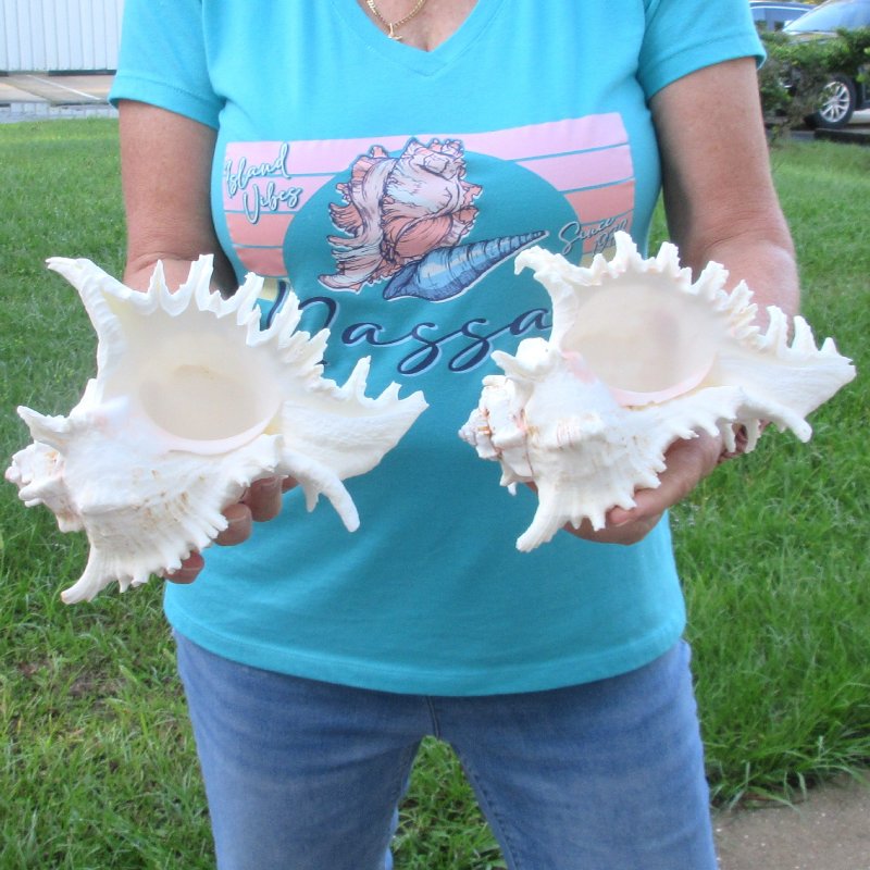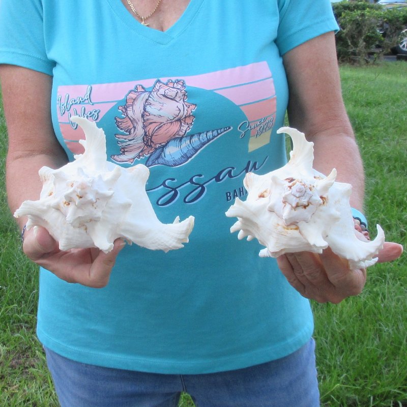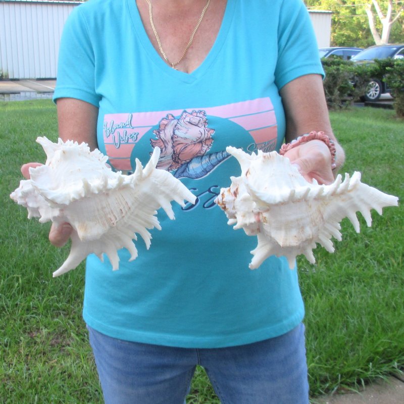 2 piece lot of Murex Ramosus (Chicoreus ramosus) for sale, also called Giant Murex shells, each measuring approximately 8 inches in size. These giant murex shells are primarily white in color with patches of tan and some have an orange or pink color in the mouth of the shells. These are real shells - not replicas. They will have natural imperfections from living in the ocean and aging. There may be a tag "Made in the Philippines" on the shell. This a requirement of U.S. Customs. All products imported into the U.S. must have a country of origin tag. The tag is a "generic" tag used by our supplier. - Review all photos.