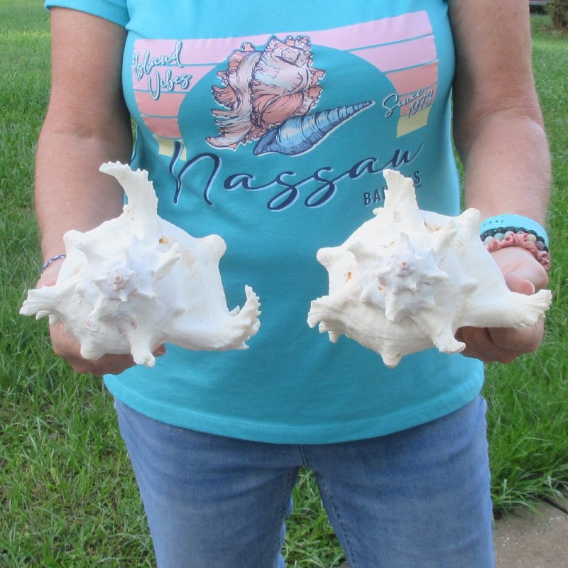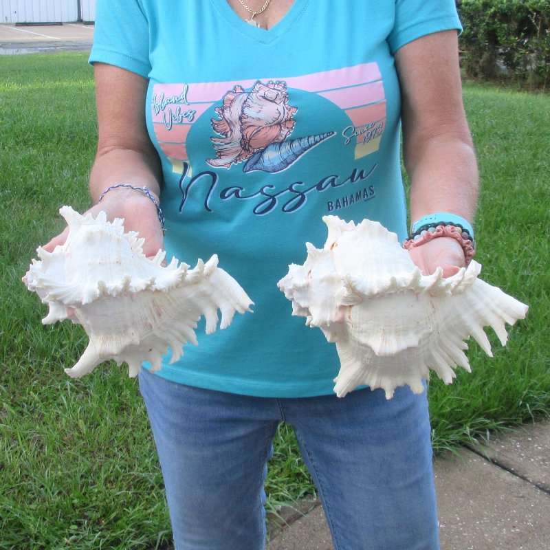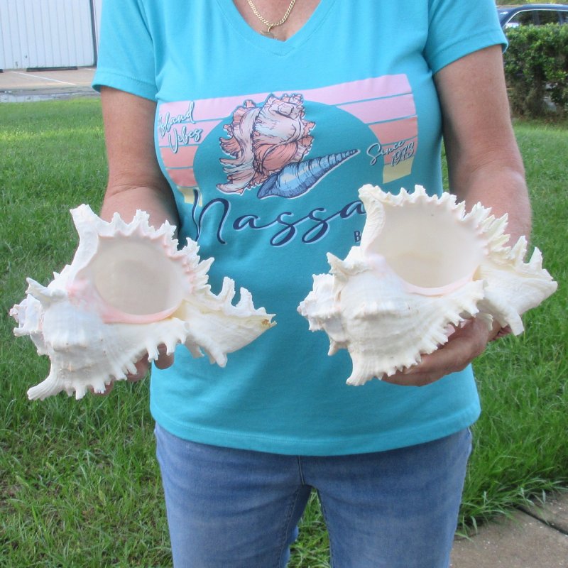 2 piece lot of Murex Ramosus (Chicoreus ramosus) for sale, also called Giant Murex shells, each measuring approximately 9 inches in size.  (Measured straight across and then down to the tip of the shell). - Review all photos These giant murex shells are primarily white in color with patches of tan and some have an orange or pink color in the mouth of the shells. These are real shells - not replicas. They will have natural imperfections from living in the ocean and aging. There may be a tag "Made in the Philippines" on the shell. This a requirement of U.S. Customs. All products imported into the U.S. must have a country of origin tag. The tag is a "generic" tag used by our supplier.