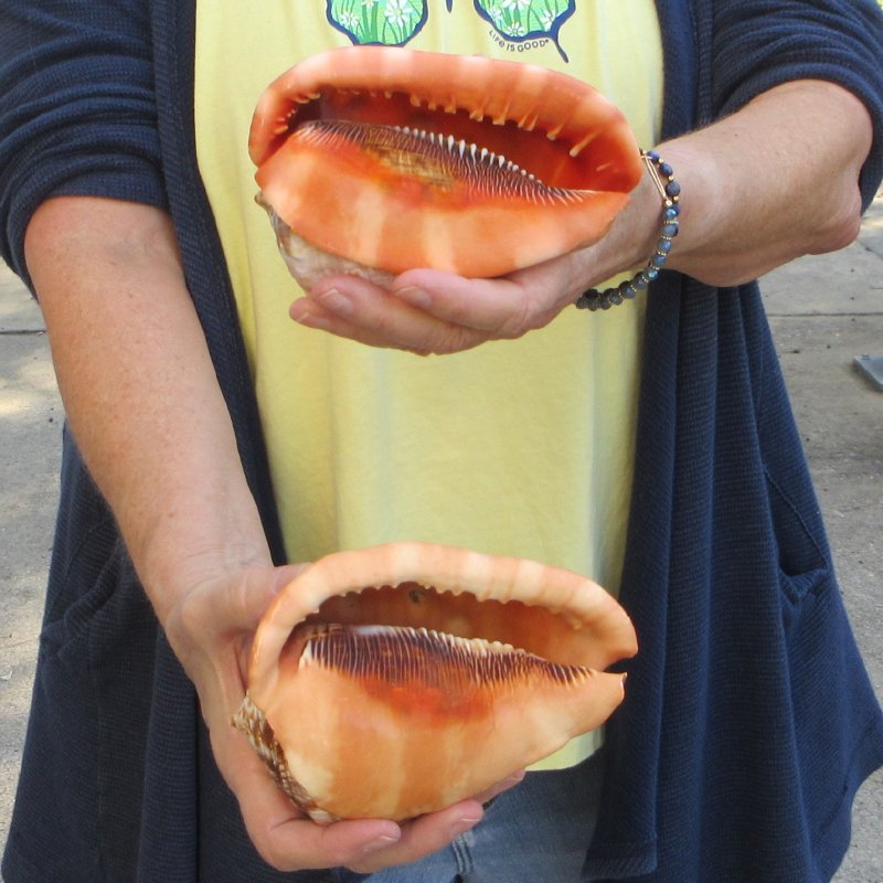 Two piece Cameo Bullmouth helmet shells with natural imperfections both measuring approximately 5 inches long. - Review photos. Hand picked from our large stock of sea shells, these Bullmouth helmet shells, or cameo shells, live mostly in warm waters around the world. Cameo shells of the male may differ from those of females. The bullmouth helmet shell's food consists mainly of sea urchins.