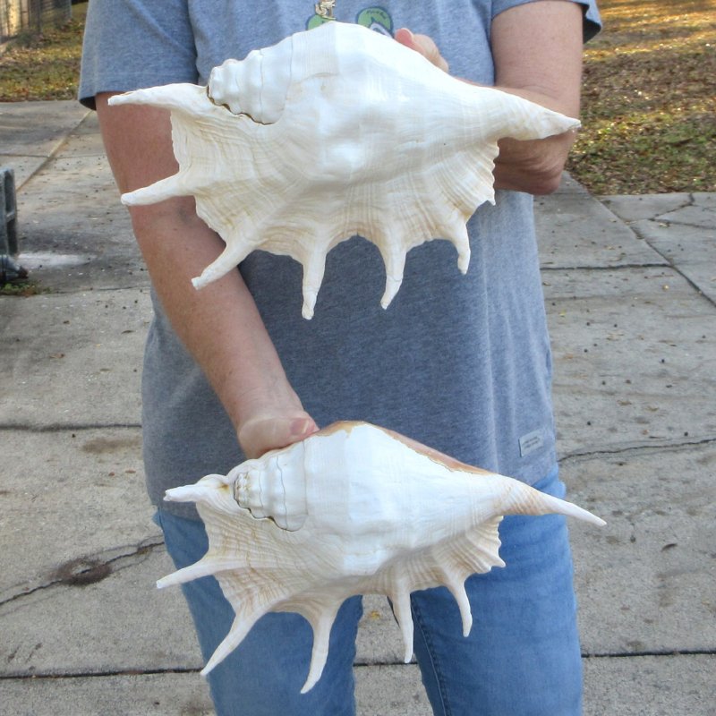 2 piece lot of Giant Spider Conch, a extra large decorative shell, measuring approximately 12 inches long, hand picked out of our large inventory of wholesale spider conch shells. Spider conch shells are referred to as Seba's Spider Conch, Lambis truncata, and are found in the Pacific and Red Sea in shallow water. - May have damage to tips. Review photos. Giant spider conchs are tan shells with a peach color interior and are large decorative seashells used in coastal home decorating and seashell decor. These shells will have natural imperfections from living in the oceans and aging. They are not specimen grade.