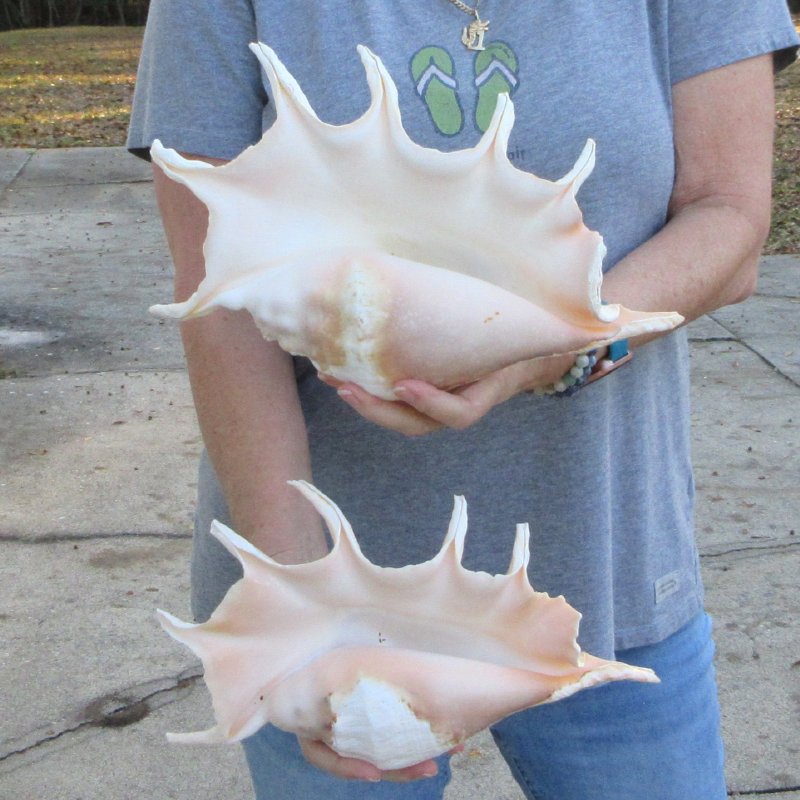 2 piece lot of Giant Spider Conch, a extra large decorative shell, measuring approximately 12 inches long, hand picked out of our large inventory of wholesale spider conch shells. Spider conch shells are referred to as Seba's Spider Conch, Lambis truncata, and are found in the Pacific and Red Sea in shallow water. - May have damage to tips. Review photos. Giant spider conchs are tan shells with a peach color interior and are large decorative seashells used in coastal home decorating and seashell decor. These shells will have natural imperfections from living in the oceans and aging. They are not specimen grade.