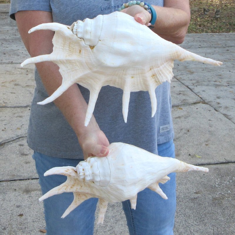 2 piece lot of Giant Spider Conch, a extra large decorative shell, measuring approximately 13 inches long, hand picked out of our large inventory of wholesale spider conch shells. Spider conch shells are referred to as Seba's Spider Conch, Lambis truncata, and are found in the Pacific and Red Sea in shallow water. - May have damage to tips. Review all photos. Giant spider conchs are tan shells with a peach color interior and are large decorative seashells used in coastal home decorating and seashell decor. These shells will have natural imperfections from living in the oceans and aging. They are not specimen grade.