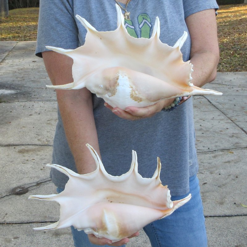 2 piece lot of Giant Spider Conch, a extra large decorative shell, measuring approximately 13 inches long, hand picked out of our large inventory of wholesale spider conch shells. Spider conch shells are referred to as Seba's Spider Conch, Lambis truncata, and are found in the Pacific and Red Sea in shallow water. - May have damage to tips. Review all photos. Giant spider conchs are tan shells with a peach color interior and are large decorative seashells used in coastal home decorating and seashell decor. These shells will have natural imperfections from living in the oceans and aging. They are not specimen grade.
