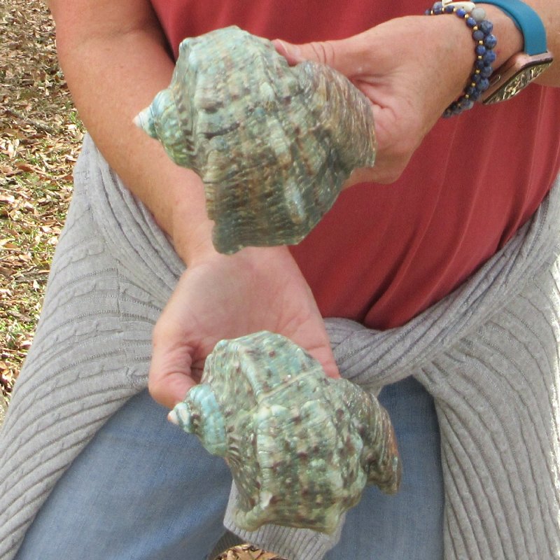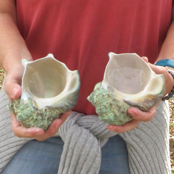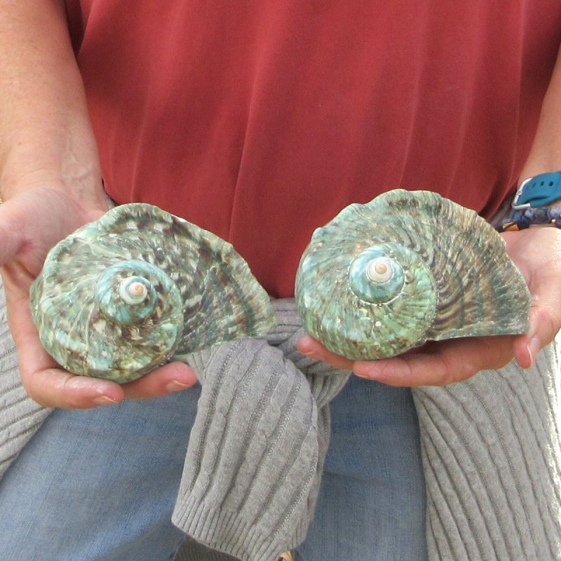 Turbo Marmoratus, green turban shell, measuring approximately 4 inches in length.  They will have natural imperfections from aging and living in the ocean, and may have surface cracks, chips on edges, broken tips, calcium build up, tiny holes, cuts, scratches, blemishes and scars. - Review Photos. It is a large species of marine gastropod with a calcareous operculum in the family turbinidae.   The color pattern is green, marbled with white and rich brown.  The 6-7 whorls on the turbo marmoratus are flattened or concave above, rounded and bearing two nodose keels below, and a stronger nodose carina above.  It bears blunt tubercles, especially strong on the shoulders. Its large, circular aperture has a golden, pearly shine.  The base of the shell is produced.