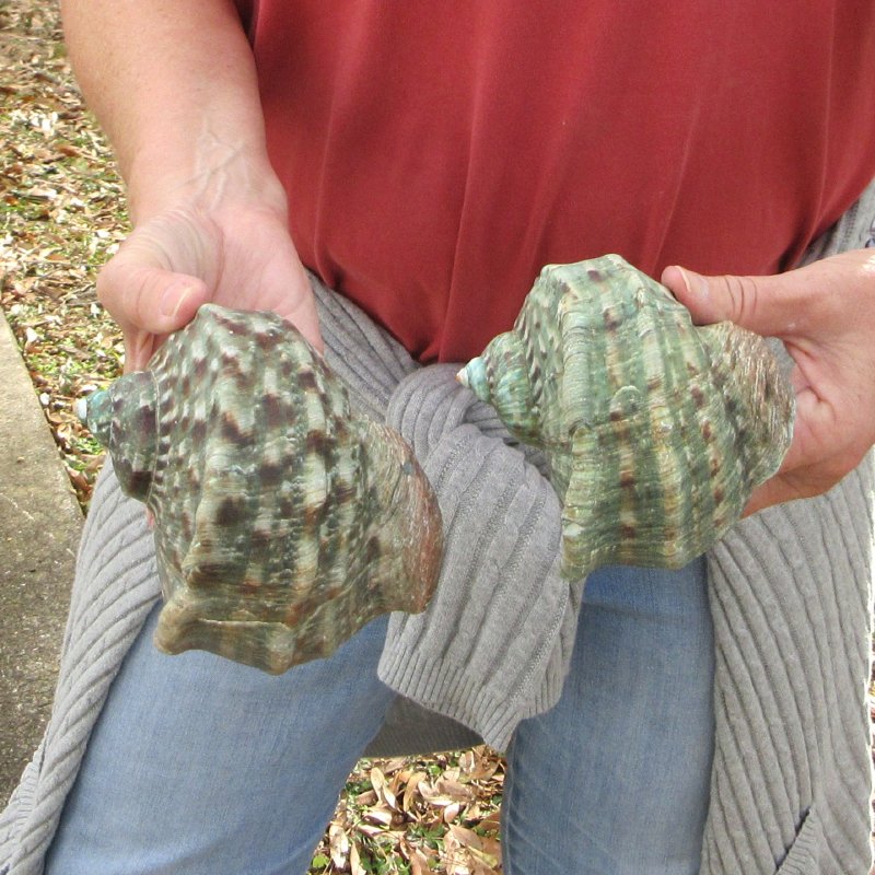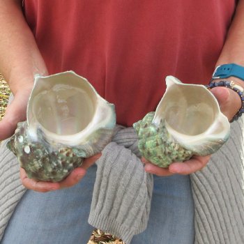 Turbo Marmoratus, green turban shell, measuring approximately 4 inches in length.  They will have natural imperfections from aging and living in the ocean, and may have surface cracks, chips on edges, broken tips, calcium build up, tiny holes, cuts, scratches, blemishes and scars. - Review Photos. It is a large species of marine gastropod with a calcareous operculum in the family turbinidae.   The color pattern is green, marbled with white and rich brown.  The 6-7 whorls on the turbo marmoratus are flattened or concave above, rounded and bearing two nodose keels below, and a stronger nodose carina above.  It bears blunt tubercles, especially strong on the shoulders. Its large, circular aperture has a golden, pearly shine.  The base of the shell is produced.