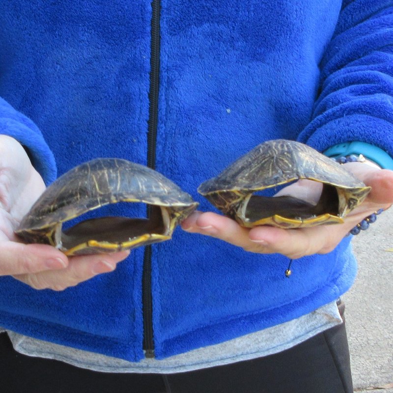 2 piece lot of Red Eared Slider Turtle Shells measuring approximately 5 to 5-1/2 inches long - Review all photos. The red eared slider is a cold-blooded animal and will usually be found during the day sitting in the sun on a rock, log, or any stumps that are near the water. Some red eared sliders can even be found stacked up to three high, basking in the sun. While the red eared slider is very hard of hearing, they are sensitive to vibration and are very alert while they are basking. These vibrations allow the red eared slider the time to make their hasty retreat into the water if they feel threatened in any way. These are empty turtle shells from real turtles and will have natural imperfections from living and aging in nature.