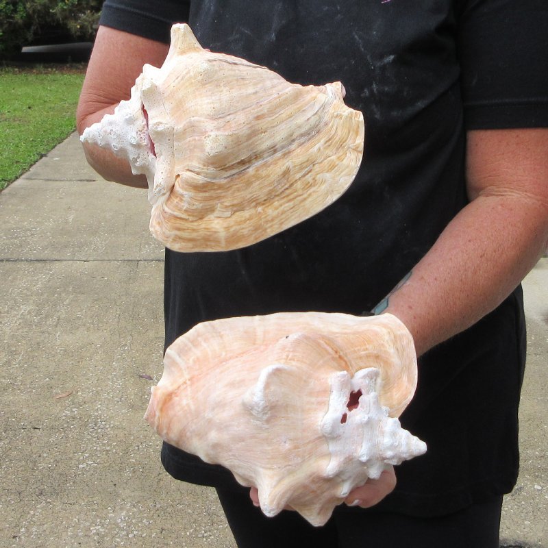 Review all photos carefully as you are buying the two pink conch shells pictured. These are nice shells, but are NOT perfect. They will have natural imperfections such as; calcification, chipped or broken points, worm holes or pock marks, chipped edges, etc., from living in the oceans and aging.