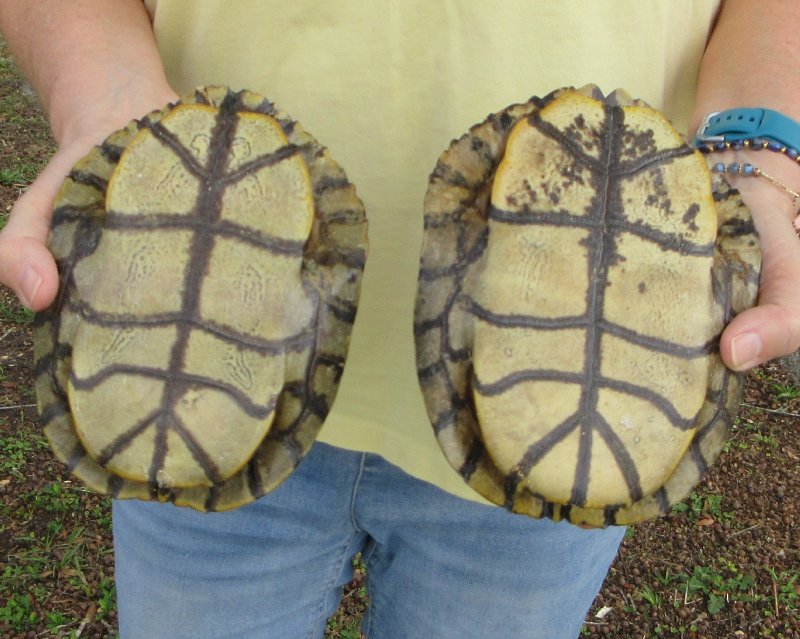 2 piece lot of Red Eared Slider Turtle Shells measuring approximately 7 to 8 inches long. - Review all photos. The red eared slider is a cold-blooded animal and will usually be found during the day sitting in the sun on a rock, log, or any stumps that are near the water. Some red eared sliders can even be found stacked up to three high, basking in the sun. While the red eared slider is very hard of hearing, they are sensitive to vibration and are very alert while they are basking. These vibrations allow the red eared slider the time to make their hasty retreat into the water if they feel threatened in any way. These are empty turtle shells from real turtles and will have natural imperfections from living and aging in nature.