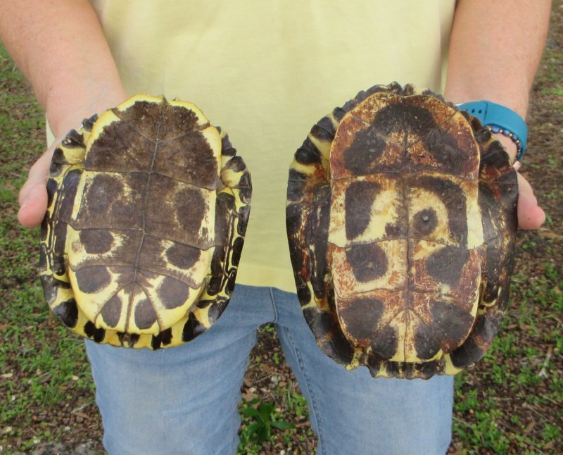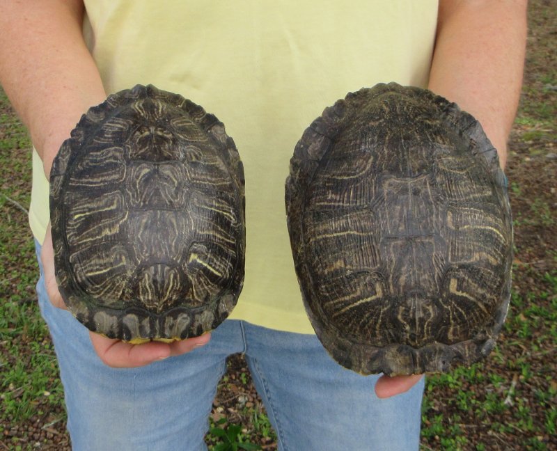 2 piece lot of Red Eared Slider Turtle Shells measuring approximately 7 to 8 inches long. Chipped- Review all photos. The red eared slider is a cold-blooded animal and will usually be found during the day sitting in the sun on a rock, log, or any stumps that are near the water. Some red eared sliders can even be found stacked up to three high, basking in the sun. While the red eared slider is very hard of hearing, they are sensitive to vibration and are very alert while they are basking. These vibrations allow the red eared slider the time to make their hasty retreat into the water if they feel threatened in any way. These are empty turtle shells from real turtles and will have natural imperfections from living and aging in nature.