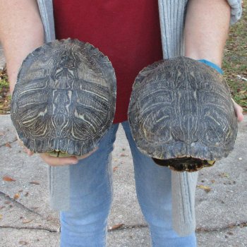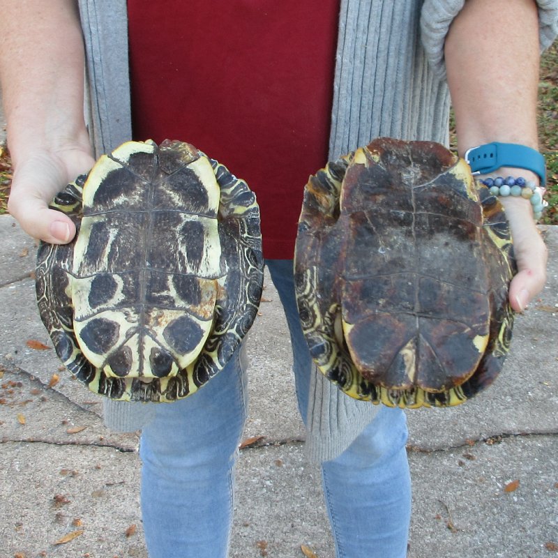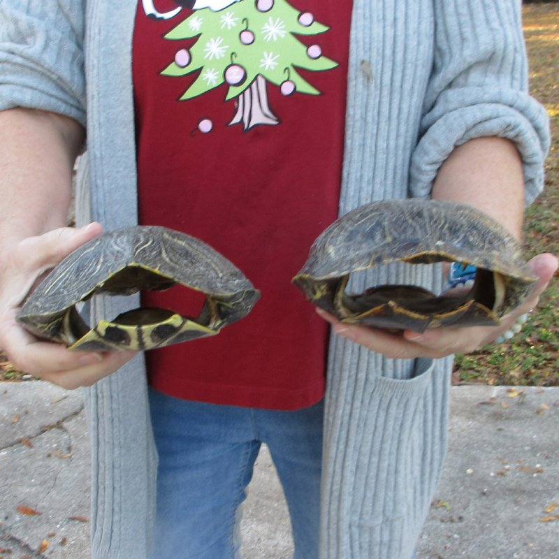 2 piece lot of Red Eared Slider Turtle Shells measuring approximately 8 inches long by 6 to 6-1/2 inches wide. - Review all photos. The red eared slider is a cold-blooded animal and will usually be found during the day sitting in the sun on a rock, log, or any stumps that are near the water. Some red eared sliders can even be found stacked up to three high, basking in the sun. While the red eared slider is very hard of hearing, they are sensitive to vibration and are very alert while they are basking. These vibrations allow the red eared slider the time to make their hasty retreat into the water if they feel threatened in any way. These are empty turtle shells from real turtles and will have natural imperfections from living and aging in nature.
