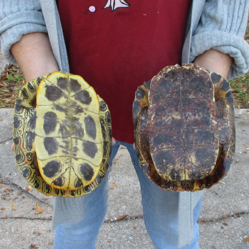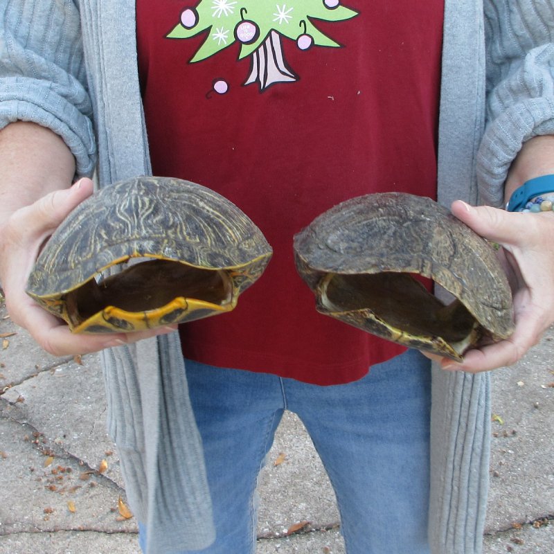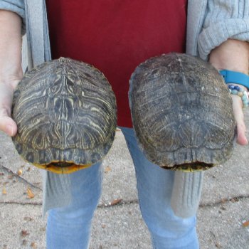 2 piece lot of Red Eared Slider Turtle Shells measuring approximately 8 inches long by 6 to 6-1/2 inches wide. - Review all photos. The red eared slider is a cold-blooded animal and will usually be found during the day sitting in the sun on a rock, log, or any stumps that are near the water. Some red eared sliders can even be found stacked up to three high, basking in the sun. While the red eared slider is very hard of hearing, they are sensitive to vibration and are very alert while they are basking. These vibrations allow the red eared slider the time to make their hasty retreat into the water if they feel threatened in any way. These are empty turtle shells from real turtles and will have natural imperfections from living and aging in nature.