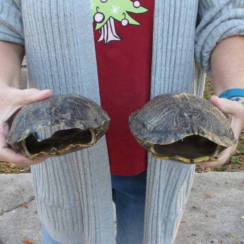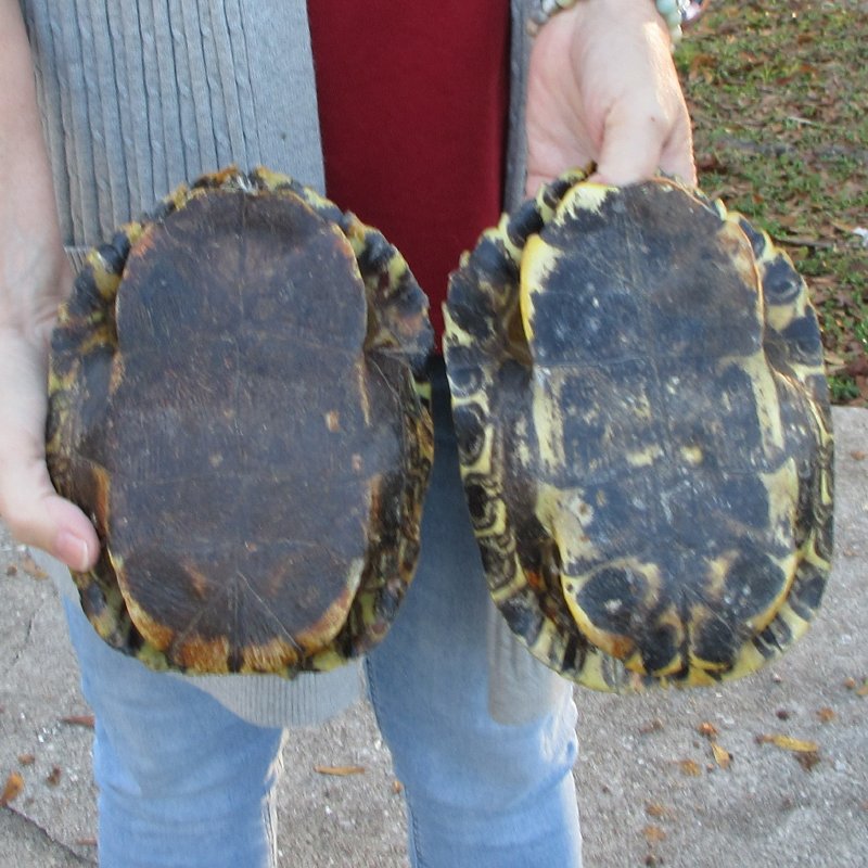 2 piece lot of Red Eared Slider Turtle Shells measuring approximately 8 inches long by 6 to 6-1/2 inches wide. - Review all photos. The red eared slider is a cold-blooded animal and will usually be found during the day sitting in the sun on a rock, log, or any stumps that are near the water. Some red eared sliders can even be found stacked up to three high, basking in the sun. While the red eared slider is very hard of hearing, they are sensitive to vibration and are very alert while they are basking. These vibrations allow the red eared slider the time to make their hasty retreat into the water if they feel threatened in any way. These are empty turtle shells from real turtles and will have natural imperfections from living and aging in nature.