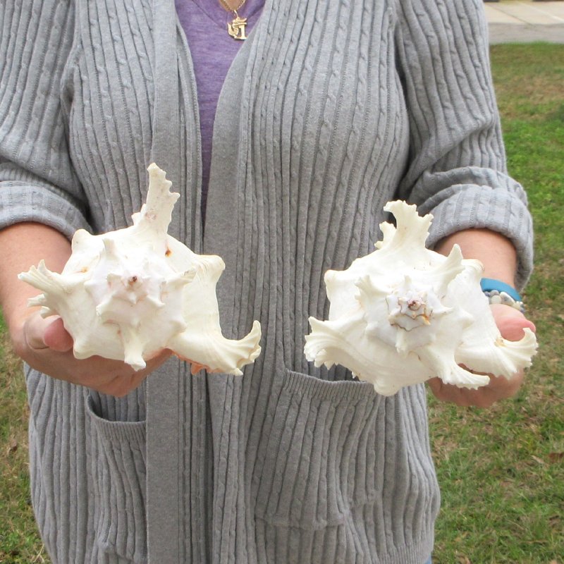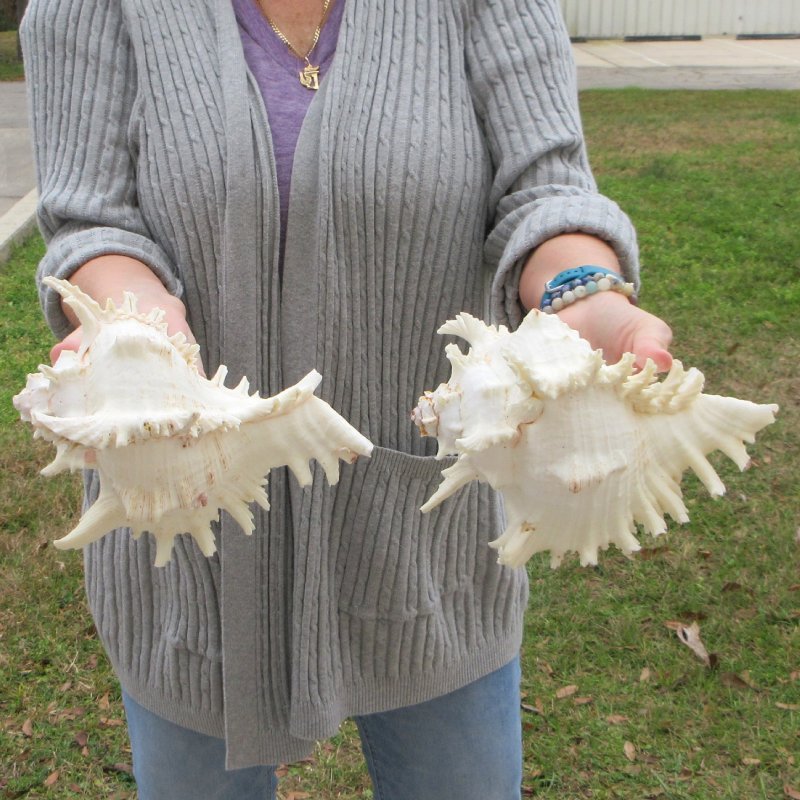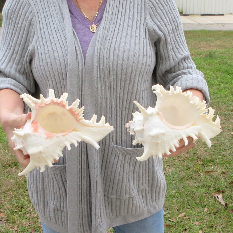 2 piece lot of Murex Ramosus (Chicoreus ramosus) for sale, also called Giant Murex shells, each measuring approximately 9 inches in size.  (Measured straight across and then down to the tip of the shell). - Review all photos. These giant murex shells are primarily white in color with patches of tan and some have an orange or pink color in the mouth of the shells. These are real shells - not replicas. They will have natural imperfections from living in the ocean and aging. There may be a tag "Made in the Philippines" on the shell. This a requirement of U.S. Customs. All products imported into the U.S. must have a country of origin tag. The tag is a "generic" tag used by our supplier.