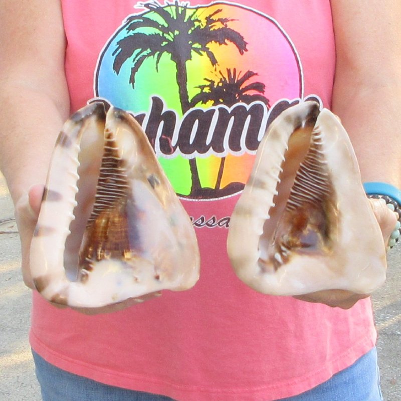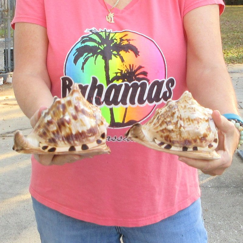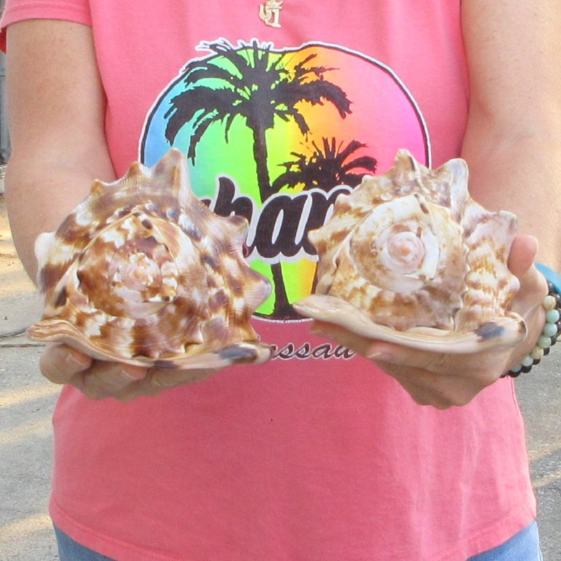 Two piece lot of King Helmet Shells, measuring approximately 6 inches high. Review photos. The helmet creature uses its radular teeth and acidic secretions to drill a hole into the shell of the urchin and digest the soft parts within. They live in shallow waters, with most of the shell buried below the surface of the sand. The larger helmets build a shield to help them glide along the sandy sea bottom and feed on members of the sea urchin family.