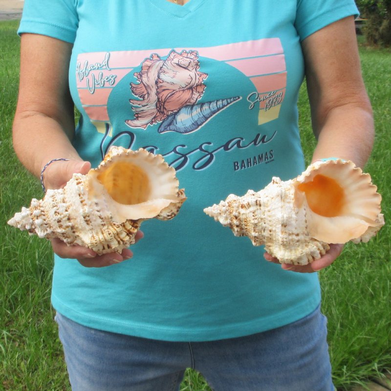 Two piece lot of Frog Shells (Bursa bubo) for sale, measuring approximately 7 inches in length. Review all photos. Giant frog shells have a wide mouth opening and are perfect for making flower centerpieces for beach weddings. Giant frog shells are found in the waters of the Indo-Pacific oceans. They are usually thick and heavy and most species live in or under coral. These large seashells are collected by shell collectors and used in coastal home decorating. This is a real shell - NOT a replica and will have natural imperfections caused by the shell living in the ocean. The larger the shell, the older it is and the more imperfections it will have.