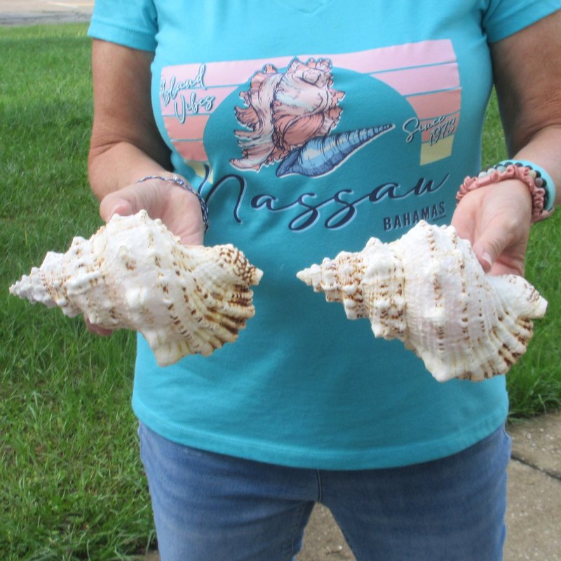 Two piece lot of Frog Shells (Bursa bubo) for sale, measuring approximately 7 inches in length. - Review all photos. Giant frog shells have a wide mouth opening and are perfect for making flower centerpieces for beach weddings. Giant frog shells are found in the waters of the Indo-Pacific oceans. They are usually thick and heavy and most species live in or under coral. These large seashells are collected by shell collectors and used in coastal home decorating. This is a real shell - NOT a replica and will have natural imperfections caused by the shell living in the ocean. The larger the shell, the older it is and the more imperfections it will have.