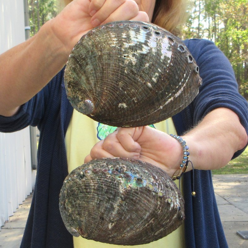 2 piece lot of Natural Green Abalone shells (Haliotis fulgens) both measuring approximately 6 and 6-3/4 inches. This abalone is 100% natural commercial grade and real, NOT a replica.  It will have natural imperfections from living in the oceans and aging. - Review photos. Natural green abalone shells have a highly iridescent inner layer of the shell of abalone that has traditionally been used as a decorative item in jewelry. Natural green abalones have a rainbow of colors from deep blues to greens with undertones of silvers and mother of pearl.