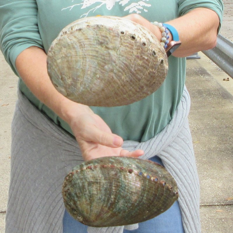 2 piece lot of Natural Green Abalone shells (Haliotis fulgens) both measuring approximately 7-1/2 inches. This abalone is 100% natural commercial grade and real, NOT a replica.  It will have natural imperfections from living in the oceans and aging. - Repair done to shell. Review photos. Natural green abalone shells have a highly iridescent inner layer of the shell of abalone that has traditionally been used as a decorative item in jewelry. Natural green abalones have a rainbow of colors from deep blues to greens with undertones of silvers and mother of pearl.