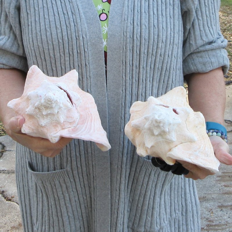 Two pink conch shells for sale (Strombus gigas), large shells for decorating. Measuring approximately 8 & 9 inches long each. These conchs will have a slit in the back of the shell, done to quickly remove the meat.  The lips have been machine edged.   These are nice shells, but are NOT perfect. They will have natural imperfections such as; chipped or broken points, holes, worm holes or pock marks, calcium build-up, chipped edges, etc., from living in the oceans and aging.  Pink conchs are found in Southeast Florida, Bermuda and the West Indies. Pink conch shells are great for display in your home or around a pool area or in a garden.