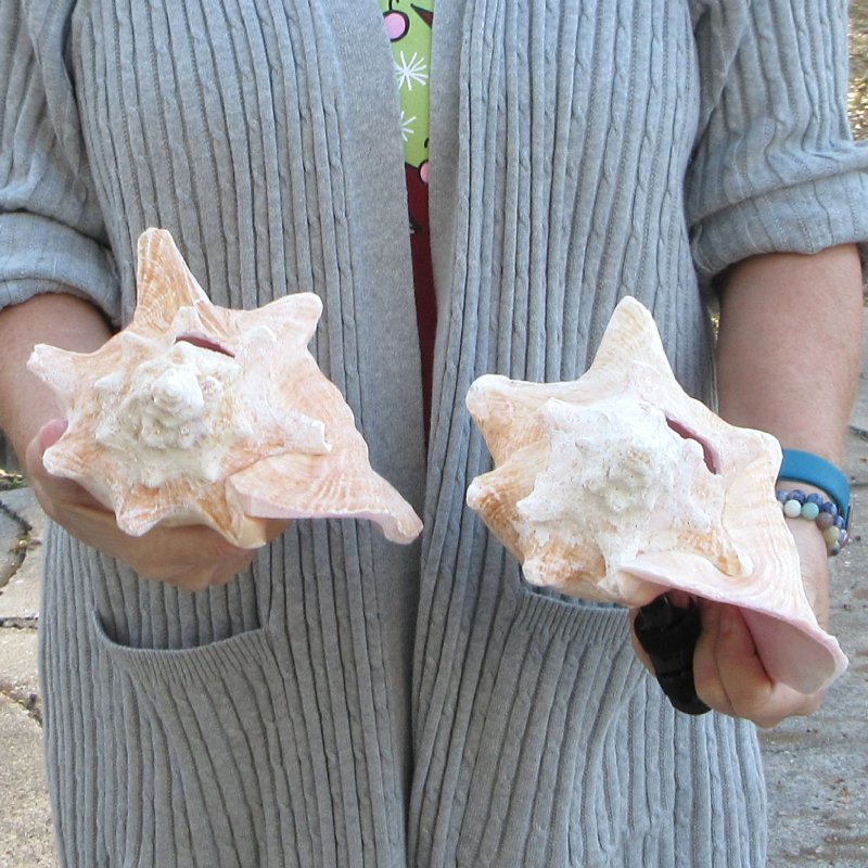 Two pink conch shells for sale (Strombus gigas), large shells for decorating. Measuring approximately 8 inches long each. These conchs will have a slit in the back of the shell, done to quickly remove the meat.  The lips have been machine edged.   These are nice shells, but are NOT perfect. They will have natural imperfections such as; chipped or broken points, holes, worm holes or pock marks, calcium build-up, chipped edges, etc., from living in the oceans and aging. Pink conchs are found in Southeast Florida, Bermuda and the West Indies. Pink conch shells are great for display in your home or around a pool area or in a garden.