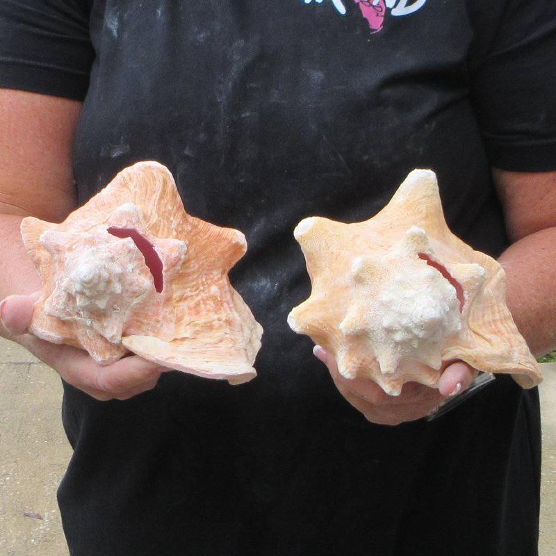 Two pink conch shells for sale (Strombus gigas), large shells for decorating. Measuring approximately 6-3/4 and 7 inches long each. These conchs will have a slit in the back of the shell, done to quickly remove the meat.  The lips have been machine edged.   These are nice shells, but are NOT perfect. They will have natural imperfections such as; chipped or broken points, holes, worm holes or pock marks, calcium build-up, chipped edges, etc., from living in the oceans and aging. -  Review all photos. Pink conchs are found in Southeast Florida, Bermuda and the West Indies. Pink conch shells are great for display in your home or around a pool area or in a garden.