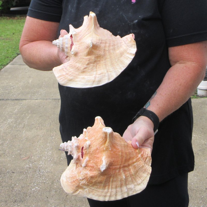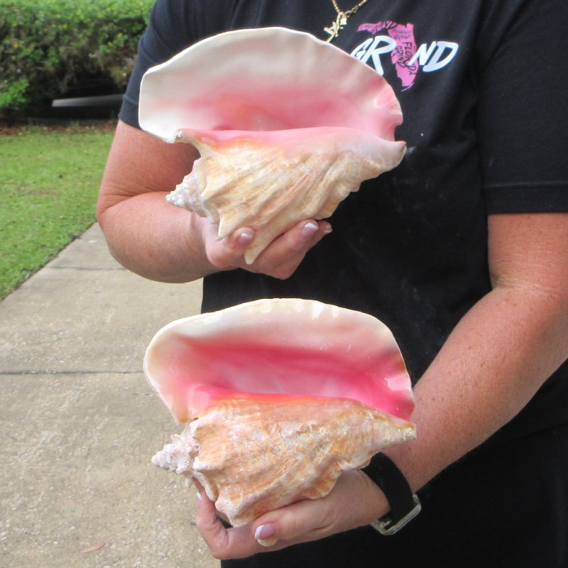 Two pink conch shells for sale (Strombus gigas), large shells for decorating. Measuring approximately 7-1/2 and 7-3/4 inches long each. These conchs will have a slit in the back of the shell, done to quickly remove the meat.  The lips have been machine edged.   These are nice shells, but are NOT perfect. They will have natural imperfections such as; chipped or broken points, holes, worm holes or pock marks, calcium build-up, chipped edges, etc., from living in the oceans and aging. - Review all photos. Pink conchs are found in Southeast Florida, Bermuda and the West Indies. Pink conch shells are great for display in your home or around a pool area or in a garden.